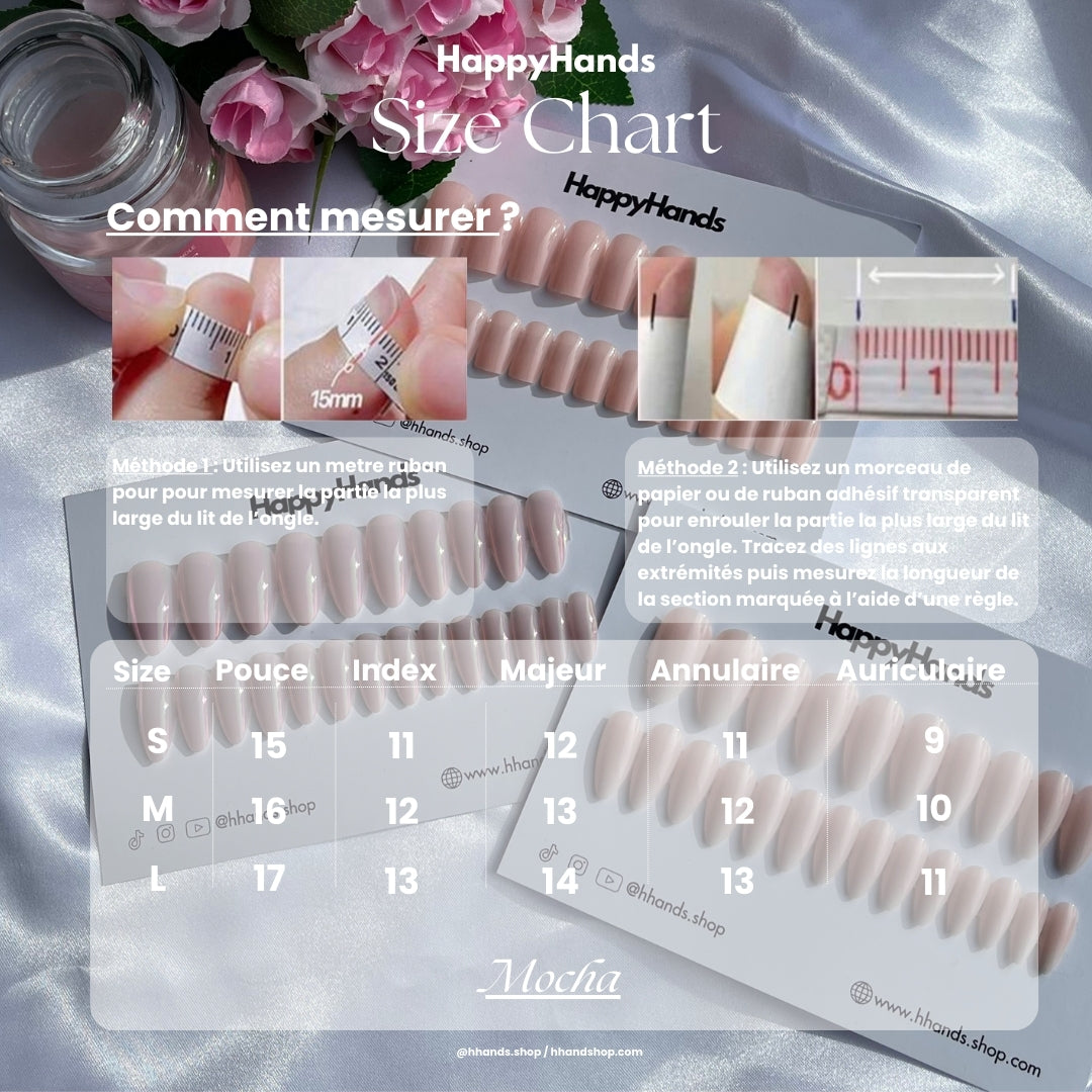 👉 Conseil taille : si vous hésitez entre deux tailles, choisissez la taille au-dessus. Les ongles peuvent ensuite être légèrement limés pour un ajustement parfait.